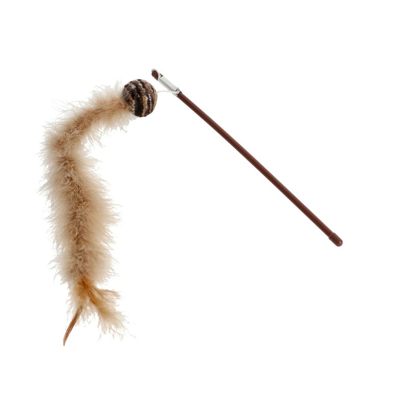 Kissanhuiska, jossa ruskea fleecepallo ja pitkä höyhenhäntä kulkusella.