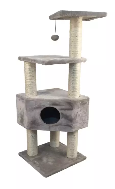 Tilaa säästävä, kestävä ja tukeva raapimapuu, jossa on suuri makuumökki, useita näköalapaikkoja ja pallo leikkiä varten.