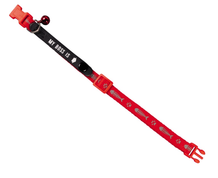 Kissoille suunniteltu heijastava pikalukkopanta, kulkusella ja puhelinnumero paikalla.