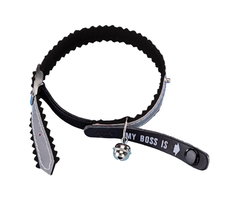 Kissoille suunniteltu heijastava solkipanta joustolla, kulkusella ja puhelinnumero paikalla.