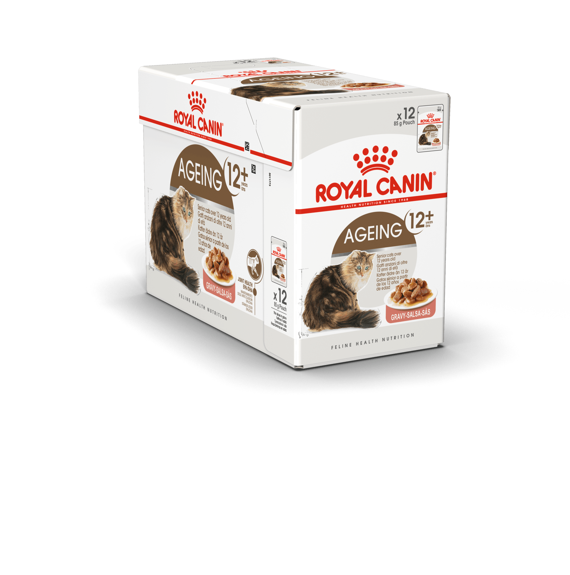 Royal Canin Ageing 12+ Wet Gravy kissojen märkäruoka on suunnattu yli 12 vuotiaille seniorikissoille.