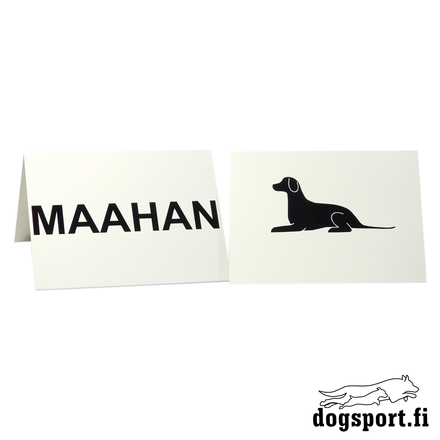 Näillä kylteillä voit korvata luoksetulon pysäytysmerkit tai Z-liikkeen merkit. Kilpailijan on mukavempi kisata, kun hän näkee kylteistä suoritettavan asennon. Kyltin toisella puolella on teksti "MAAHAN" ja toisella puolella makaavan koiran figuuri.
