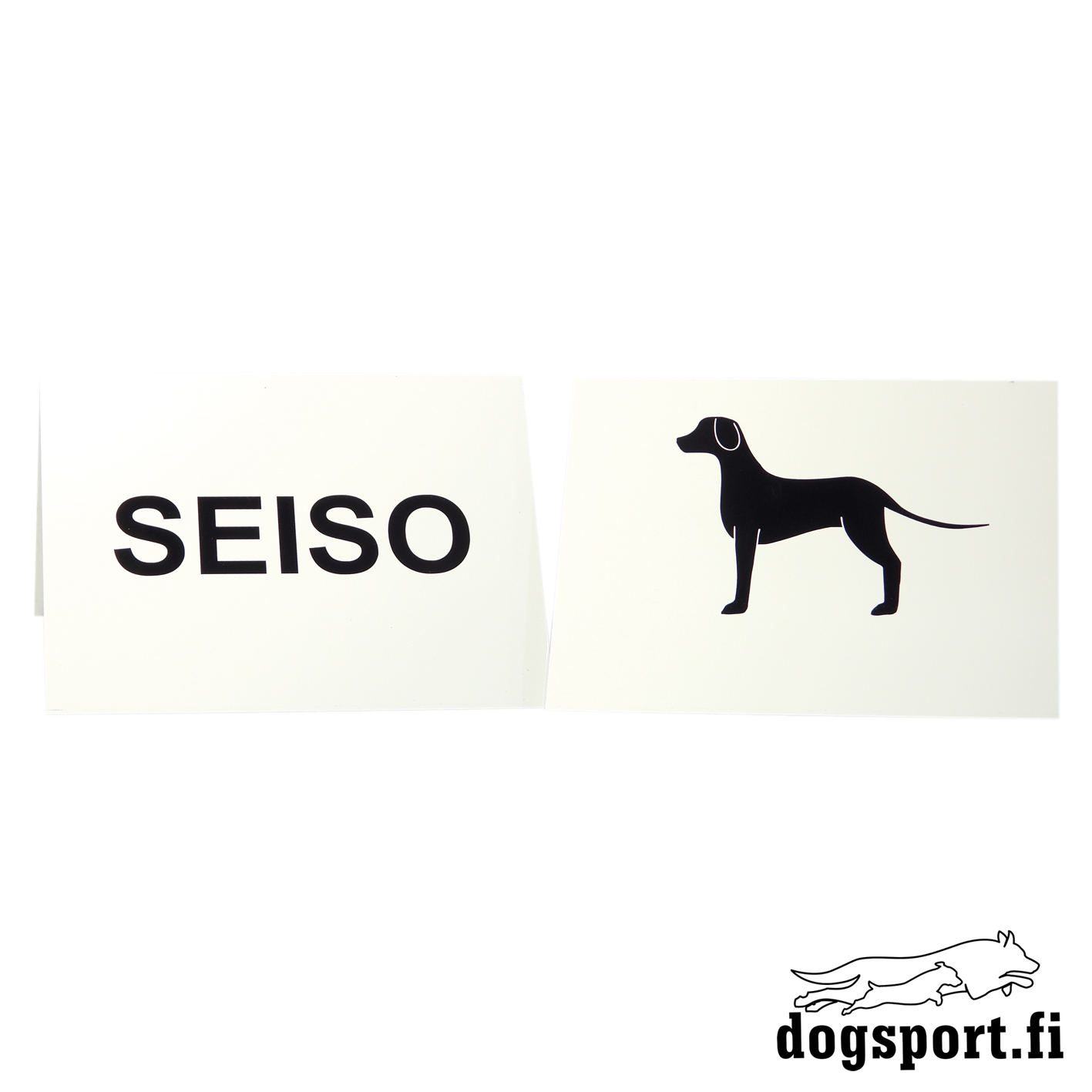Näillä kylteillä voit korvata luoksetulon pysäytysmerkit tai Z-liikkeen merkit. Kilpailijan on mukavempi kisata, kun hän näkee kylteistä suoritettavan asennon. Kyltin toisella puolella on teksti "SEISO" ja toisella puolella seisovan koiran figuuri.
