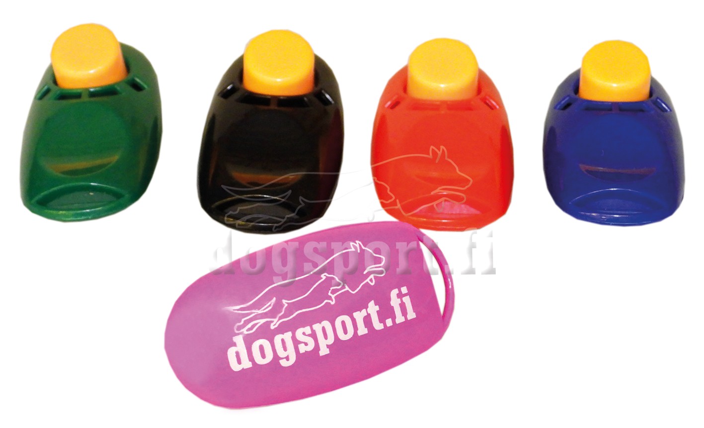 i-Clickeriä löytyy useampaa eri väriä, kaikissa väreissä nappi on keltainen! Naksuttimen toisella puolella on dogsport.fi logo!