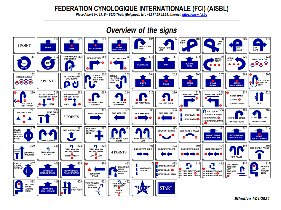 FCI:n kansainvälisten sääntöjen mukaiset, laminoidut rally-tokon tehtäväkyltit. Kylttien koko A4.