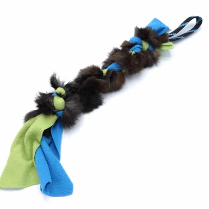 Fleecestä ja aidosta kaninkarvasta letitetty köysilelu.