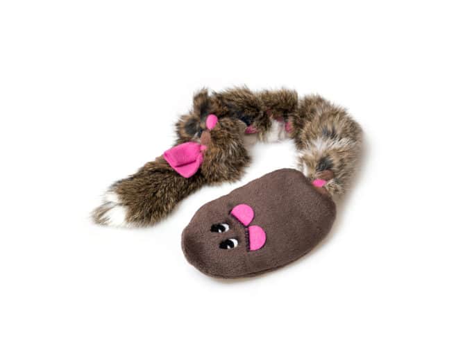 Polyesterikankaasta ommeltu suloinen rotta on varustettu aidolla kaninkarvahännällä, joka taatusti herättää koiran mielenkiinnon.