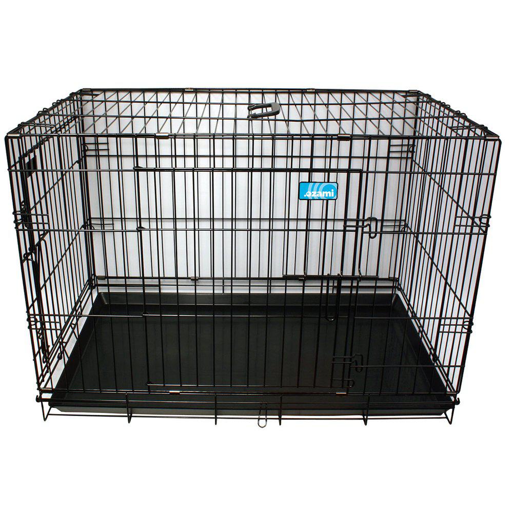 Musta koiran metallihäkki kahdella ovella on kokoontaittuva, kevytmetallinen häkki, joka soveltuu esimerkiksi näyttelyihin tai lemmikin kuljettamiseen autossa. Siinä on salpalukittuva ovi sen yhdellä lyhyellä että pitkällä sivulla. (Huom! Pienimmässä koossa on vain yksi ovi häkin päädyssä.)