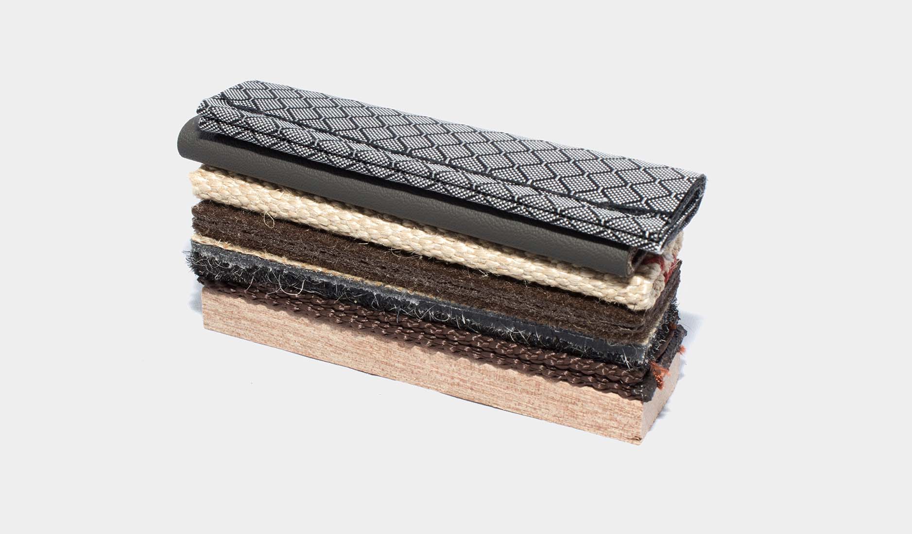 Esineiden materiaalit ovat nylonnauha, kangas, synteettinen, huopa, puu, juutti ja keinonahka.