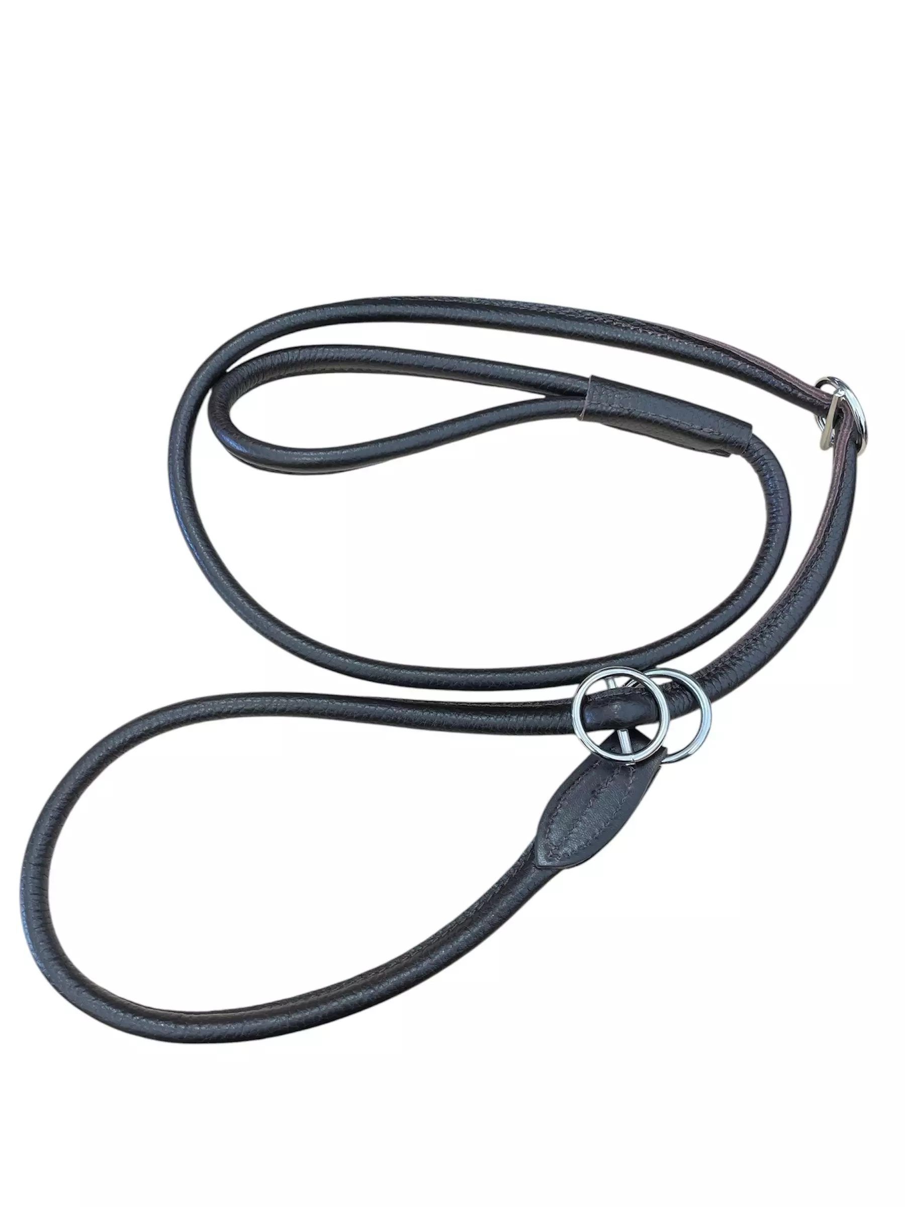 Noutajamallinen pyöreästä nahasta valmistettu näyttelytalutin jossa kaksi metallistopperia jolla saa säädettyä kaulaosan sopivan kokoiseksi.
