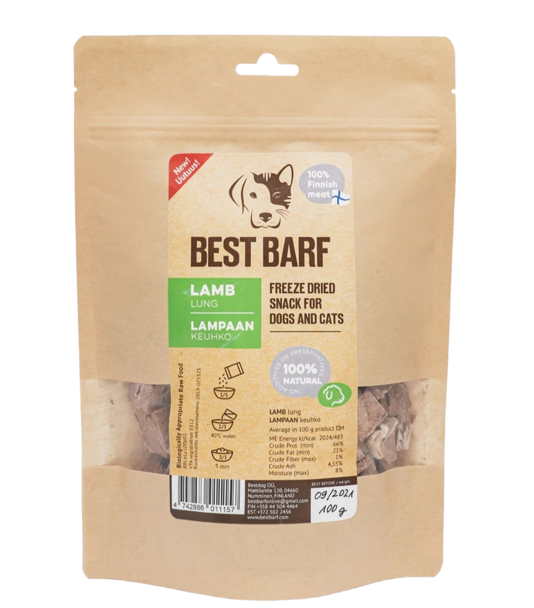 Best Barf pakastekuivattu lampaan keuhko on terveellinen välipala, herkku tai lisuke ruoalle. Suomalainen lampaan keuhko sisältää vain yhtä raaka-ainetta ja pakastekuivatuksen ansiosta raa’an lihan ravintoarvot ja maku säilyvät. Säilytä suljetussa pakkauksessa, kuivassa ja suojassa valolta.