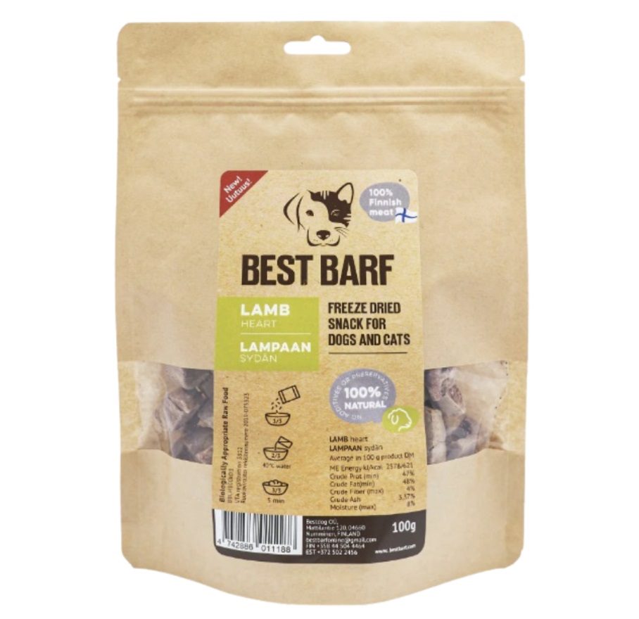 Best Barf pakastekuivatut lampaan sydänpalat ovat terveellinen välipala, herkku tai lisuke ruoalle. Suomalaiset lampaan sydänpalat sisältävät vain yhtä raaka-ainetta ja pakastekuivatuksen ansiosta raa’an lihan ravintoarvot ja maku säilyvät. Säilytä suljetussa pakkauksessa, kuivassa ja suojassa valolta.