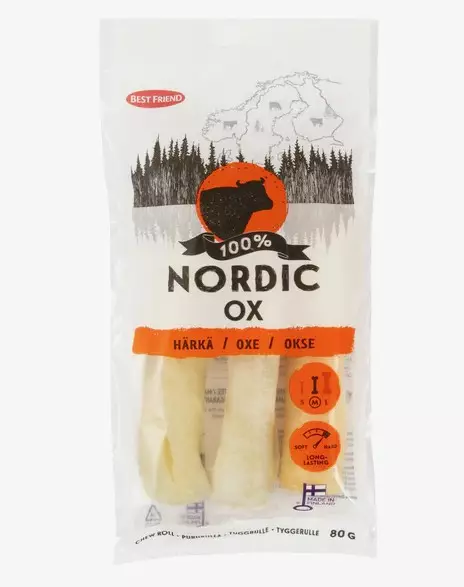 Best Friend Nordic härkäpururulla on täysin luonnollinen ja valmistettu ilman turhia käsittelyaineita, kuten valkaisuainetta. Lopputuloksena on täyteläinen maku ja poikkeuksellisen luja koostumus antaen reilusti vastusta vaativimmallekin purukalustolle.