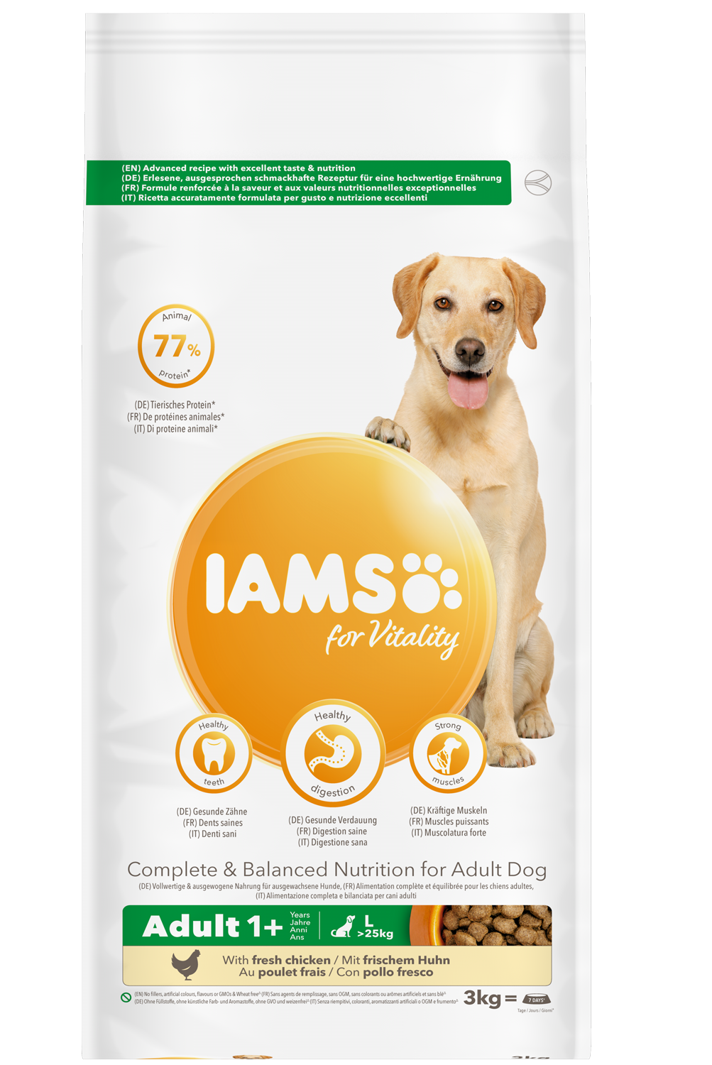 IAMS for Vitality Adult Large Breed -ruoassa yhdistyvät tasapainoinen koostumus ja herkullinen maku.