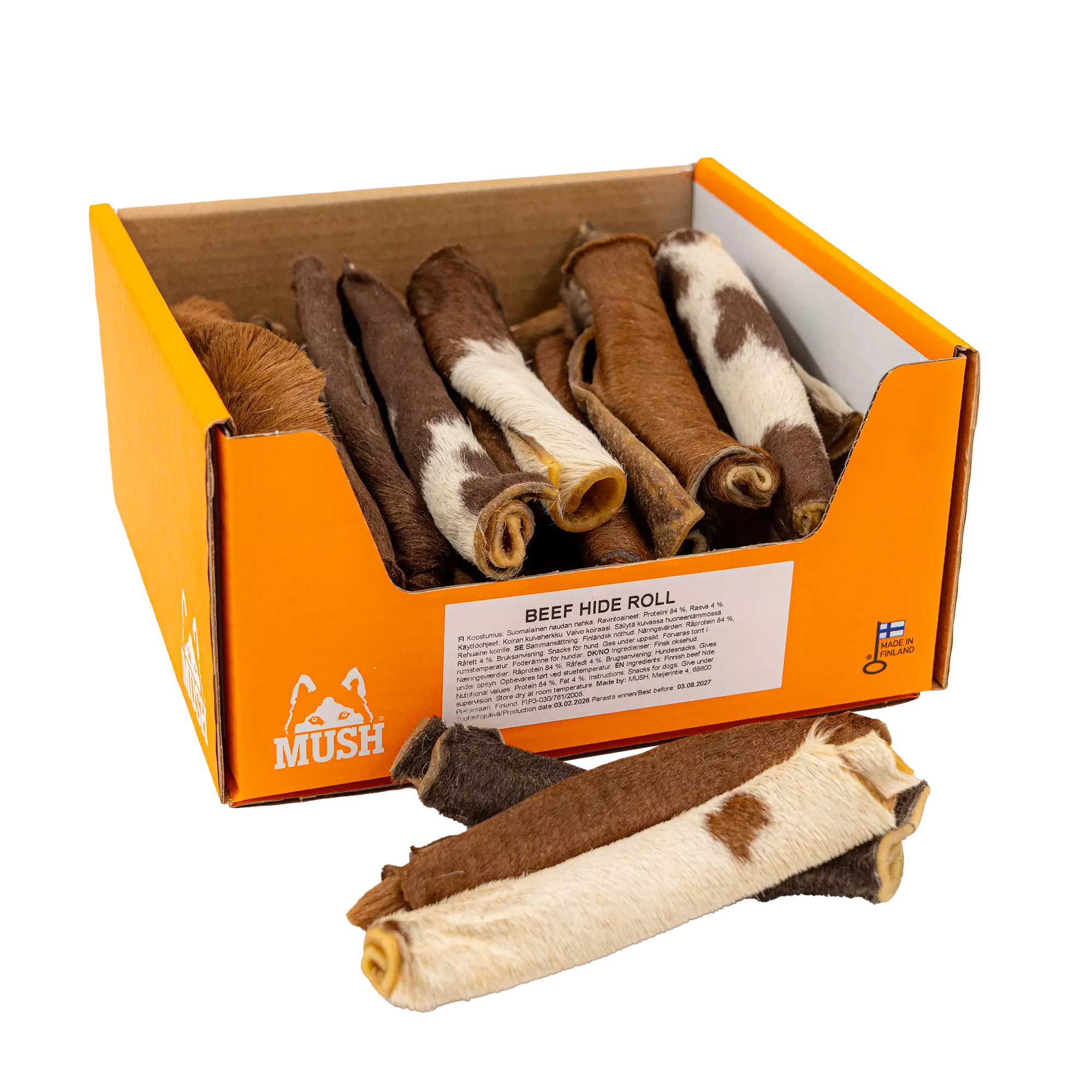 Suomessa valmistettu naudannahkainen puruluu karvoilla.