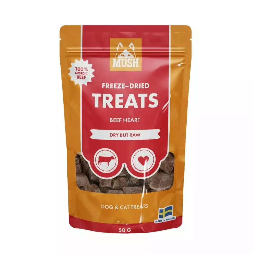Mush Freeze-Dried Treats täysliha makupalat sisältävät 100% hellästi pakastekuivattua naudansydäntä pohjoismaisista raaka-aineista. Herkulliset pakastekuivatut namit soveltuvat erinomaisesti harrastuksiin ja koulutustilanteisiin.