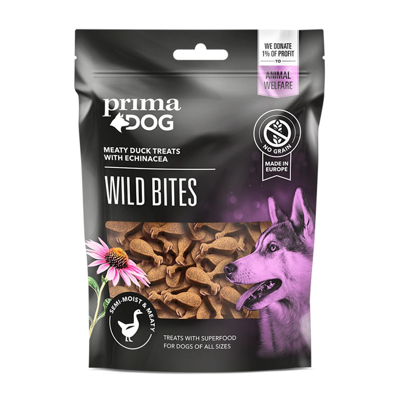PrimaDog Wild Bites -makupalojen erikoisuutena ovat superfood-ainesten terveyttä tukevat ominaisuudet. PrimaDog Wild Bites Ankka ja auringonhattu -koiranherkun jokaisessa suupalassa on vastustuskykyä ylläpitävää auringonhattua.