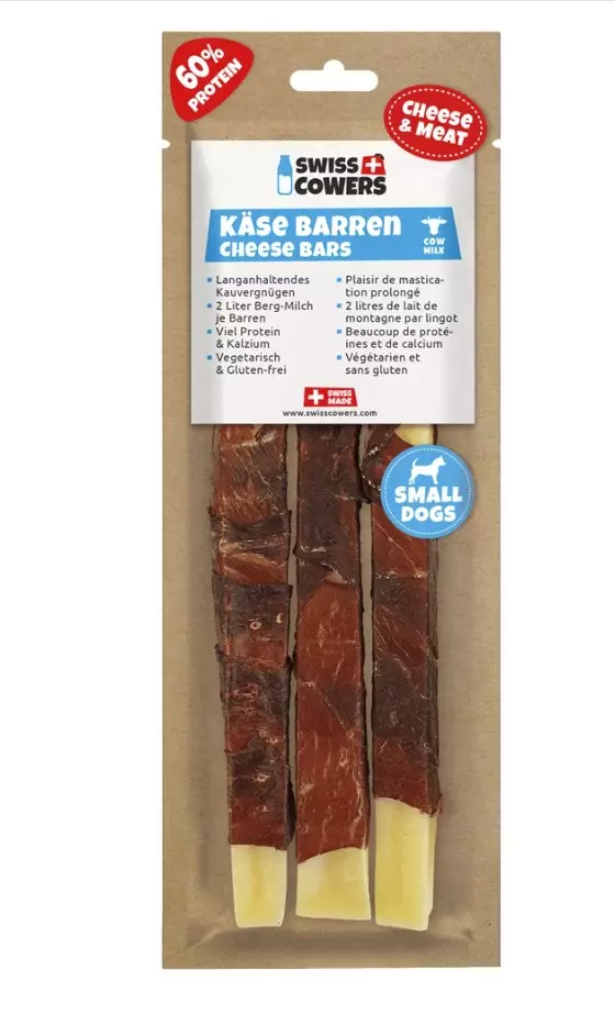 SwissCowers juustopatukat on kääritty herkulliseen naudanlihaan, jota yksikään koira ei voi vastustaa! Patukoihin käytetty naudanliha tulee yksinomaan Sveitsistä.