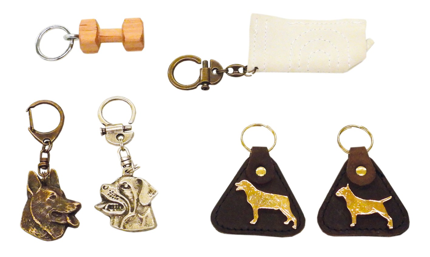 Valikoima erilaisia koira-aiheisia avaimenperiä.