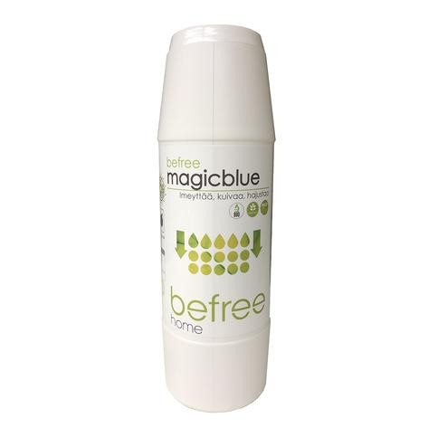Imeyttää kaiken vesipitoisen nesteen. Tuotteella on korkea imukyky ( 1kg tuotetta imee keskimäärin 30 litraa nestettä). Befree Magicblue kuivaa ja poistaa hajut ja hajustaa. Sopii mm. imeyttämään lemmikkien vahingot ja läikkyneet nesteet.