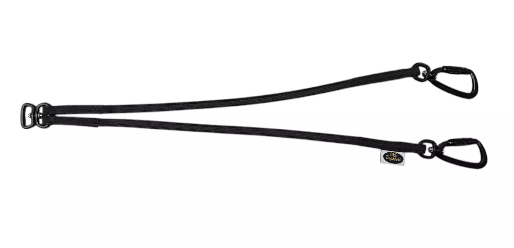 D&C Supergrip taluttimen jakaja on valmistettu mustasta 12mm leveästä polypropeenista, jossa neuloksien välissä on kumilankapunos sekä kaksi alumiinista lukittuvaa Twistlock -lukkoa, joiden vetolujuus on noin 400 kg. Tämä taluttimen jakaja sopii parhaiten keskikokoisille ja isoille koirille.