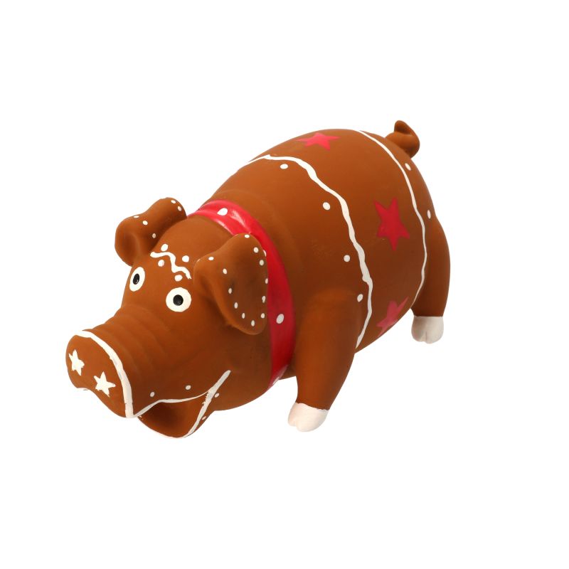 Klassikko lateksipossu on pukeutunut jouluasuun ja on nyt valloittava piparkakku! Tuttu röhkivä ääni takaa koirille hauskat leikit.