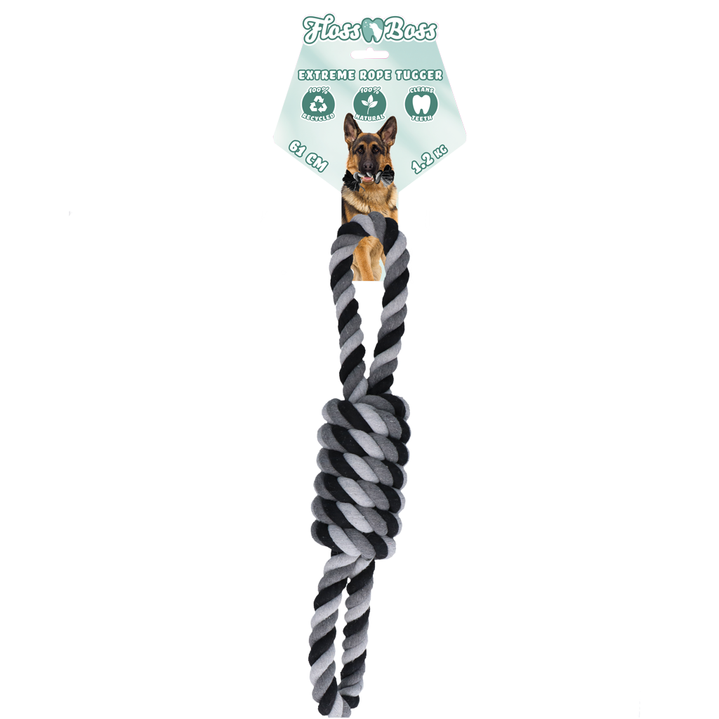 Floss Dental Extreme tugger 61cm Hammaslankaköysilelu on valmistettu 100% luonnonpuuvillasta, mikä tekee siitä turvallisen, kestävän ja ympäristöystävällisen. Sopii nouto- ja vetoleikkeihin.