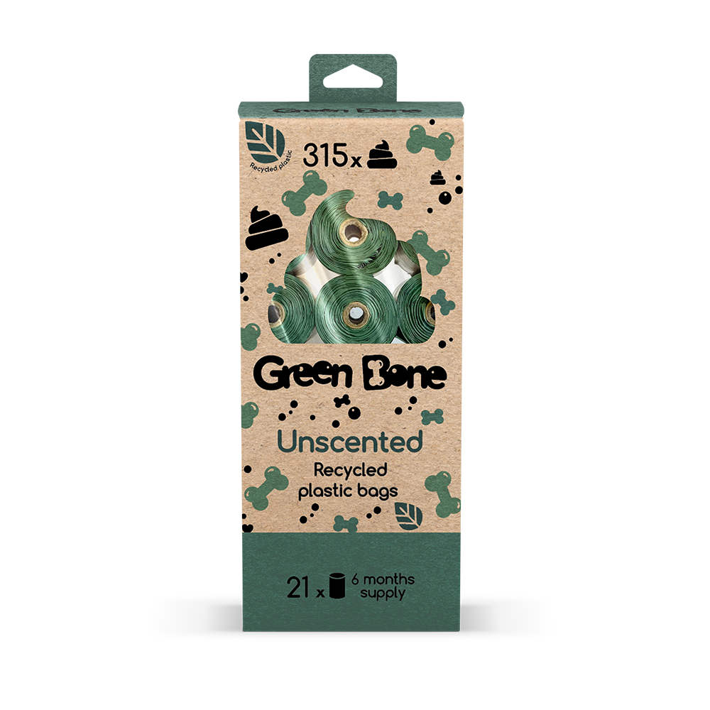 100% kierrätetystä muovista valmistettu koiran kakkapussi ilman kahvoja. Pussit ovat väriltään vihreitä ja ne ovat hajuttomia.