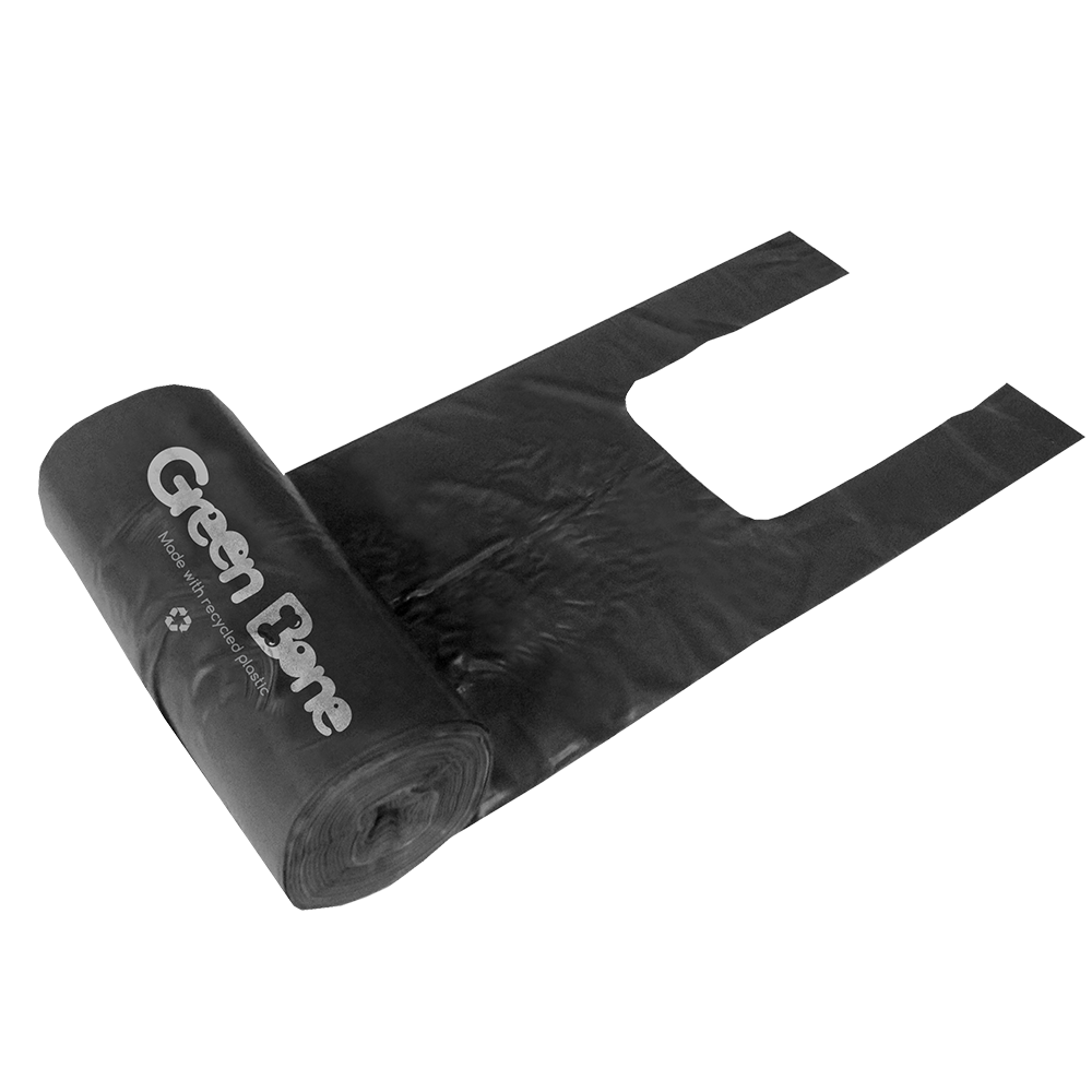 Kierrätetystä muovista valmistettu koiran kakkapussi kahvoilla. Pussit ovat väriltään mustia ja ne ovat hajuttomia.