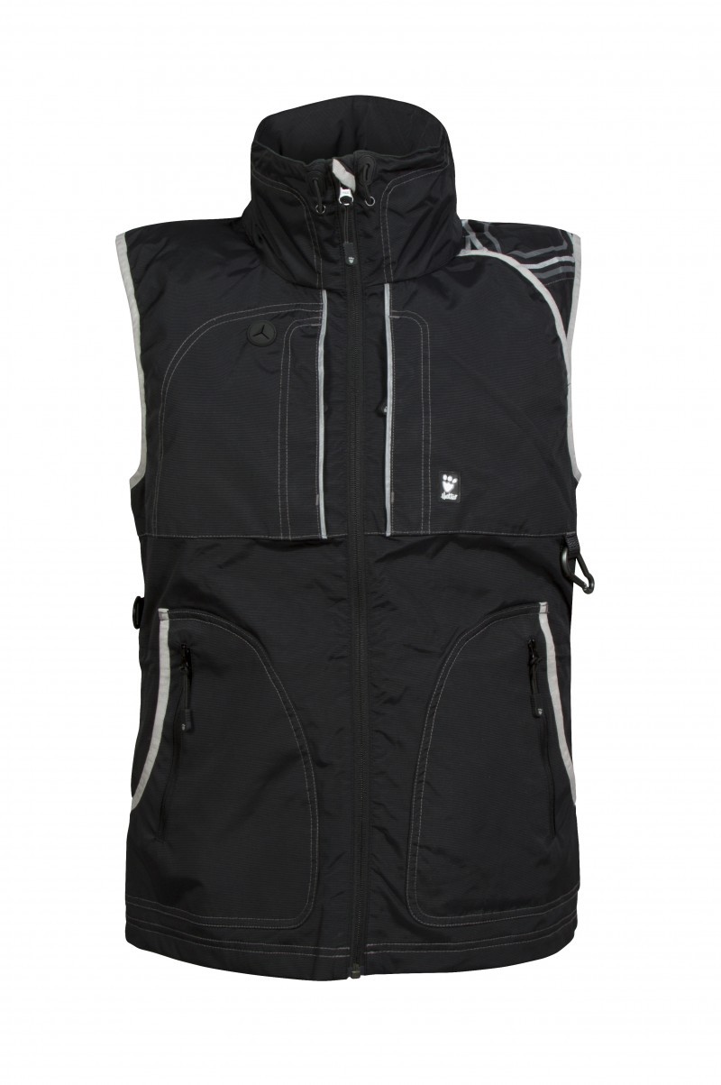 Hyvin istuvan liivin vyötärön ja korkean kauluksen voi säätää itselle sopiviksi. Kauluksen sisältä löytyy ohut ja vedenpitävä huppu. Liivin etuosassa on neljä vetoketjutaskua sekä irrotettava ja pestävä herkkutasku tahmeille makupaloille. Liivin suuriin sivu-, rinta-ja takataskuihin mahtuu helposti isommatkin motivointilelut ja -tarvikkeet.
