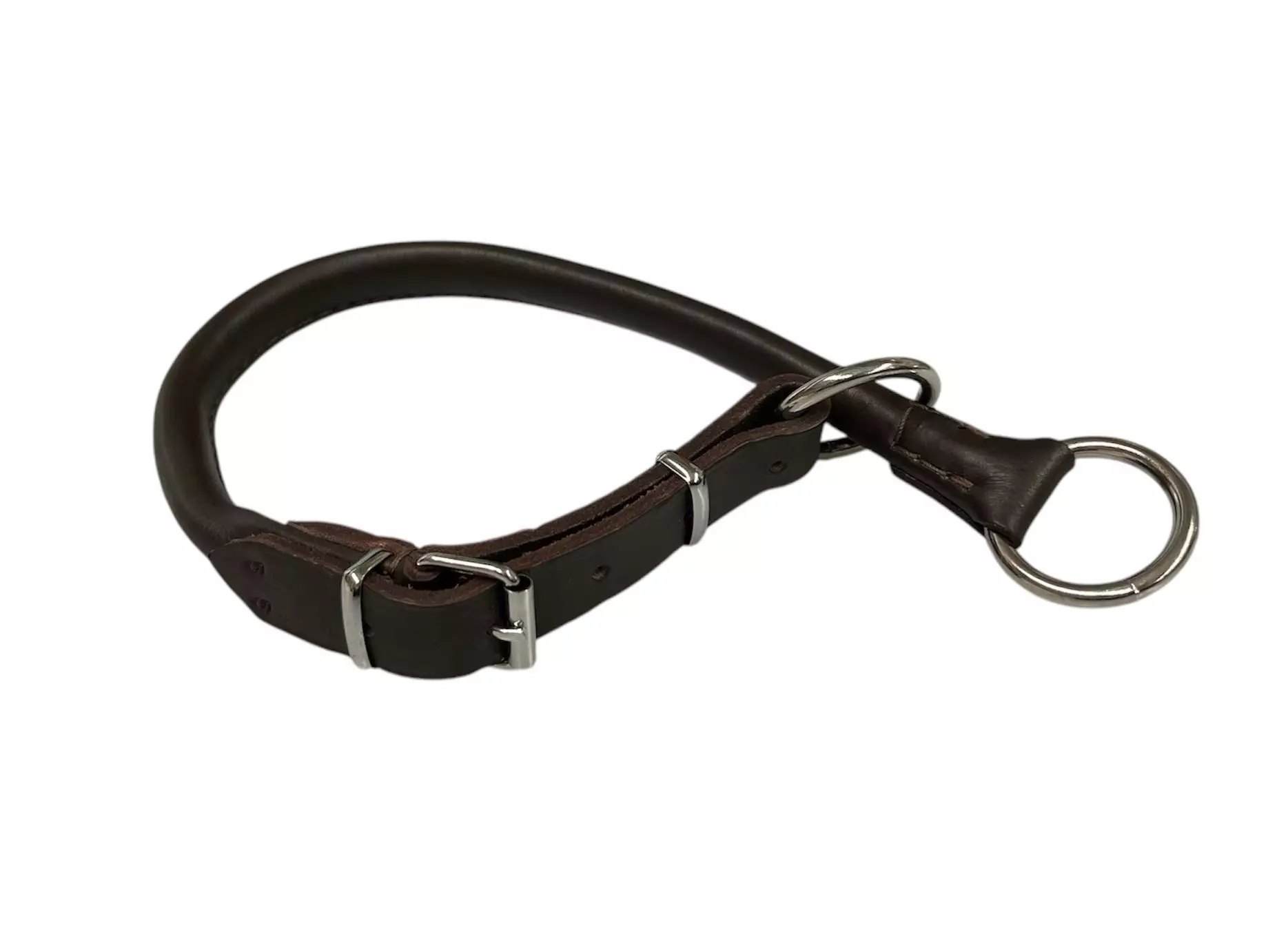 Aitoa nahkaa oleva kokokiristävä panta, jossa on teräksinen solki ja renkaat.