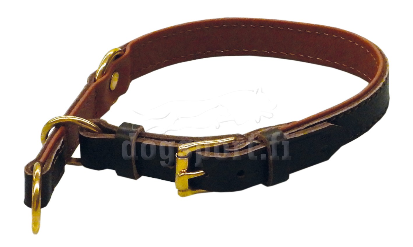 Aitoa nahkaa oleva puolikiristävä panta, jossa on messinkinen solki ja renkaat.