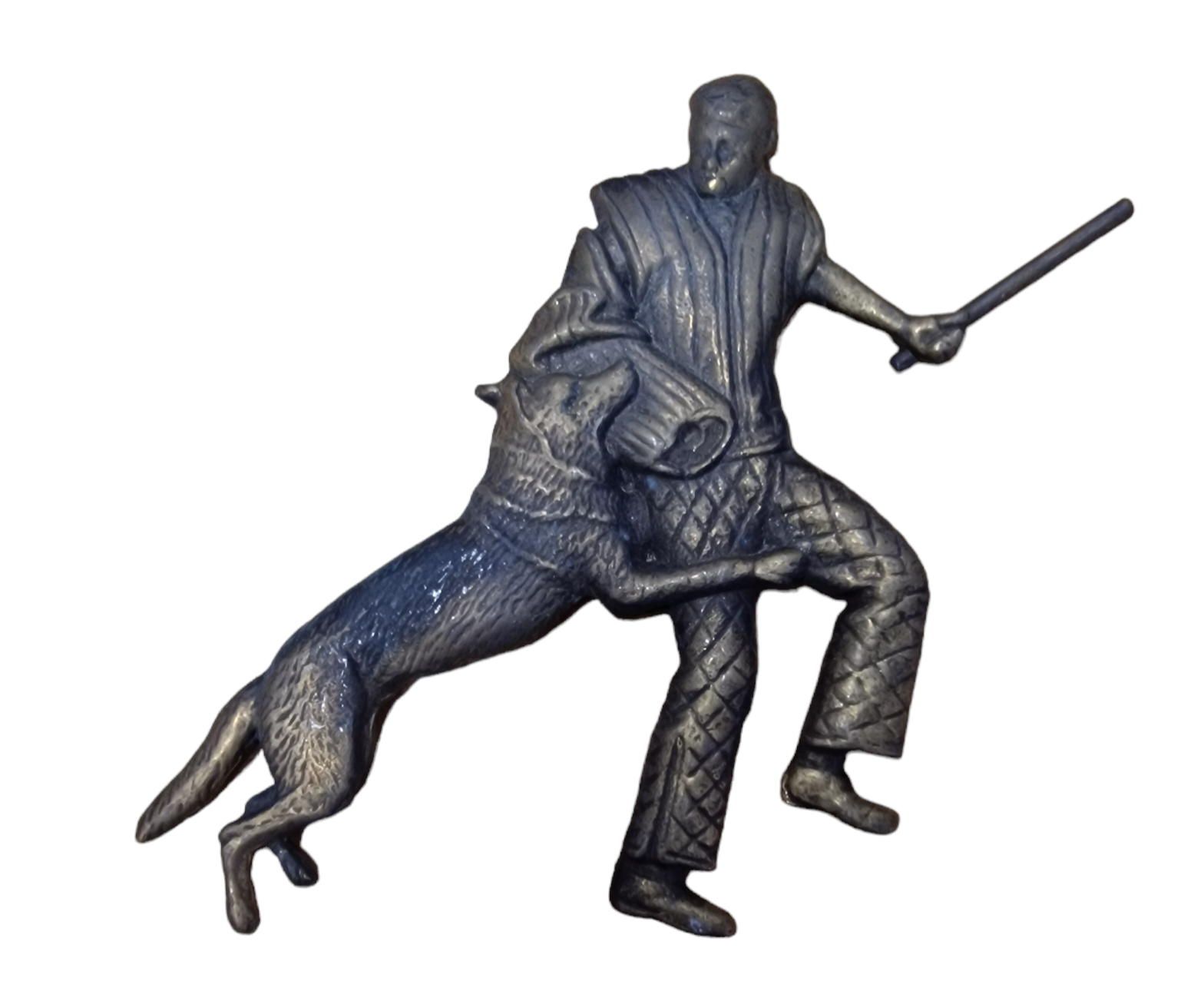 Upea patinoitua messinkiä oleva maalimiesaiheinen figuuri.