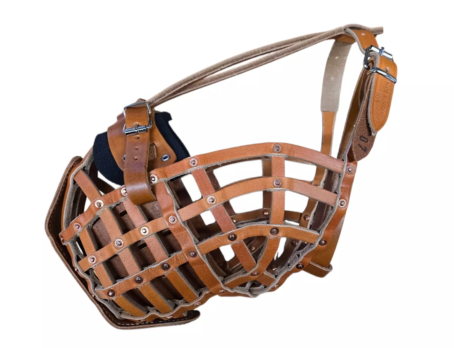Laadukas käsintehty nahkainen kuonokoppa metallivahvikkeella.