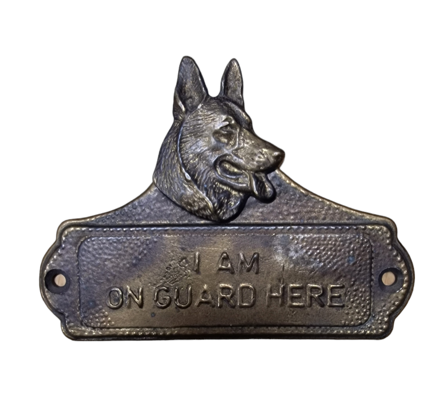 Kyltin teksti "I am on guard here". Kyltissä kaksi kiinnitysreikää.