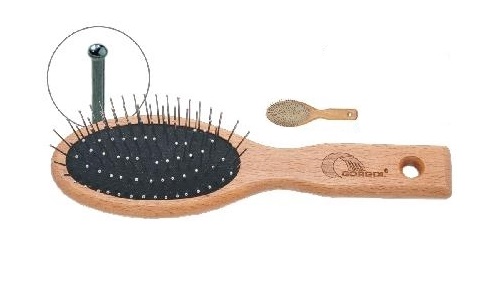 Perinteinen puuvarsinen piikkiharja, metallipiikit joissa metalliset pallot piikkien päässä. Pallot ja piikit ovat yhteinäisiä (palloja ei ole kiinnitetty erikseen, vaan ne muodostetaan valmistusprosessin kanssa samaan aikaan) ja siksi se ei revi turkkia. Pehmeä ja hellävarainen, joustavapohjainen. Varsi aitoa lakattua puuta. 7 riviä piikkejä.