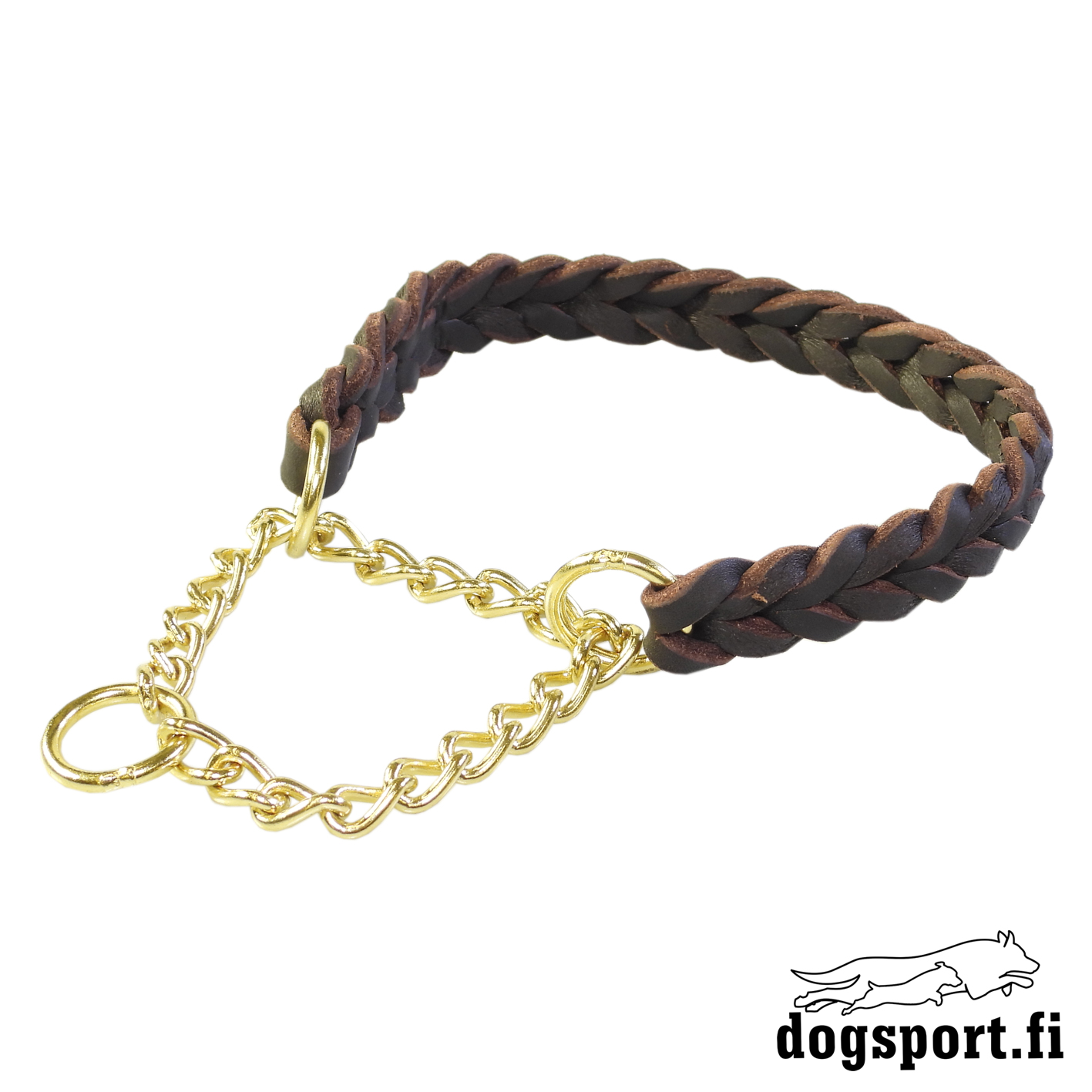 Aidosta nahasta valmistettu punottu puolikiristävä nahkapanta messinkisellä ketjulla.