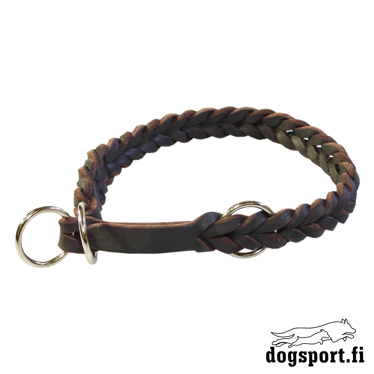 Aidosta nahasta käsityönä punottu puolikiristävä nahkapanta teräksisillä renkailla.
