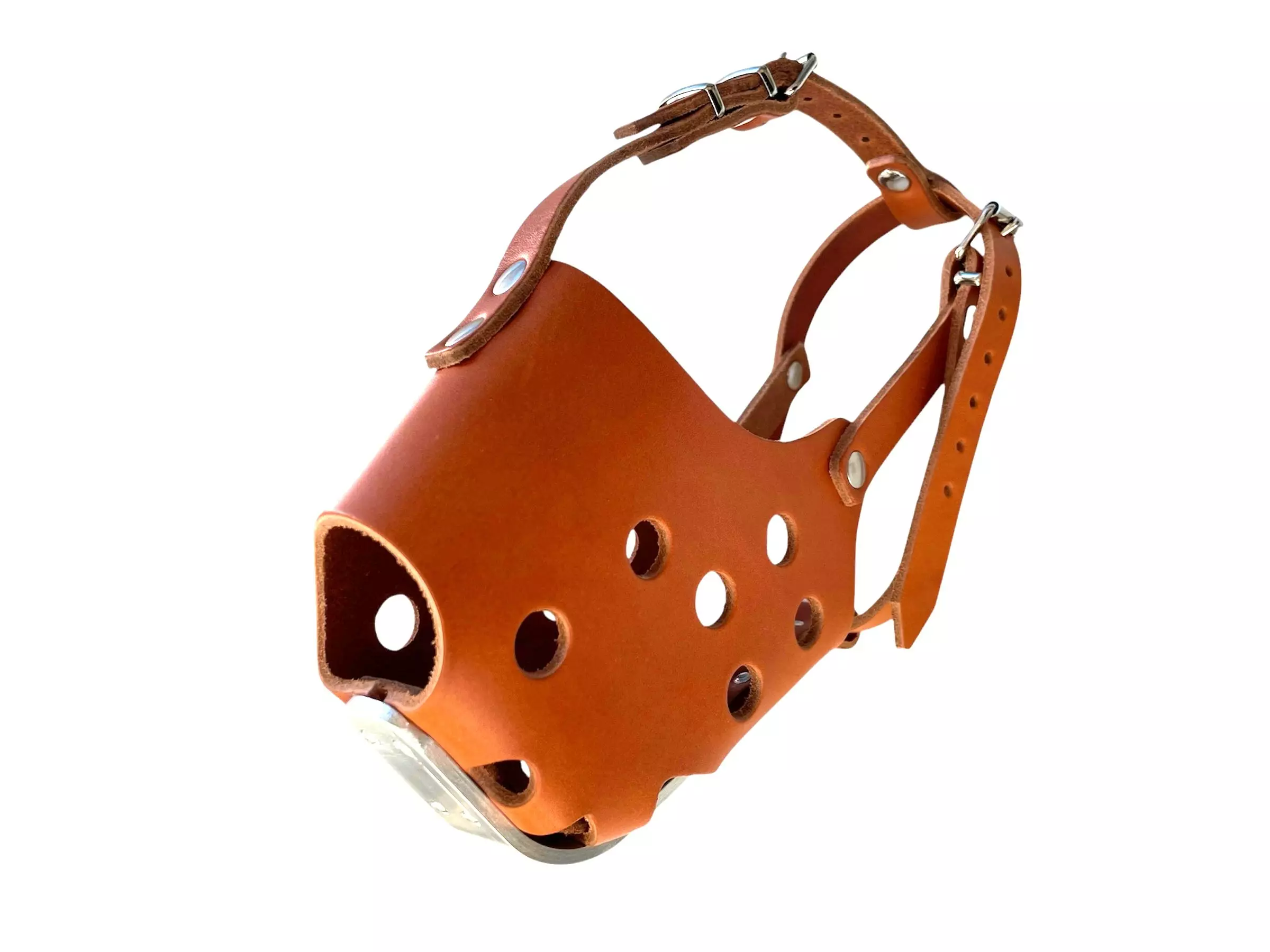 Laadukas nahkainen kuonokoppa metallivahvikkeella.