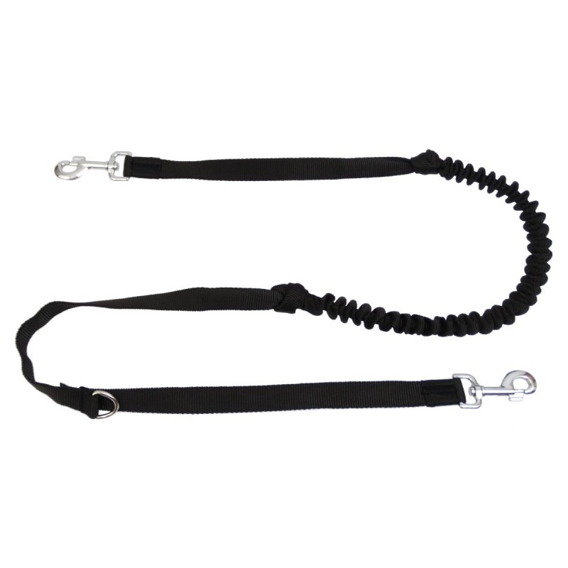 Kuvista poiketen tässä liinassa on kaksi isohkoa, messinkistä pistoolilukkoa. Lukkojen koon ja jouston vahvuuden takia suosittelemme tätä joustoliinaa keskikokoisille ja suurille koirille. Tässä liinassa on myös yksi D-lenkki, jonka ansiosta siitä saa tehtyä myös käsilenkillisen joustotaluttimen.