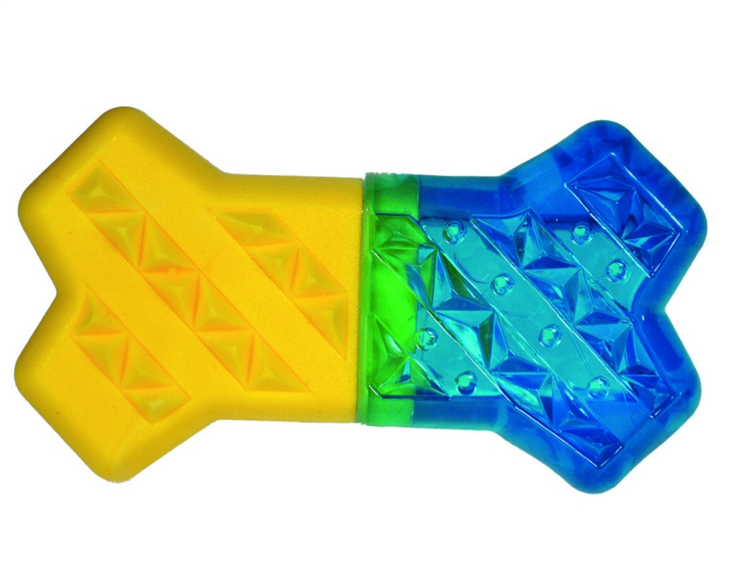 Täytä luun muotoinen lelu vedellä ja jäädytä. Anna jäätynyt lelu koiralle, jonka jälkeen se alkaa sulaa hitaasti ja valuttaa vettä pienten reikien läpi. Suositellaan käytettäväksi ulkona.