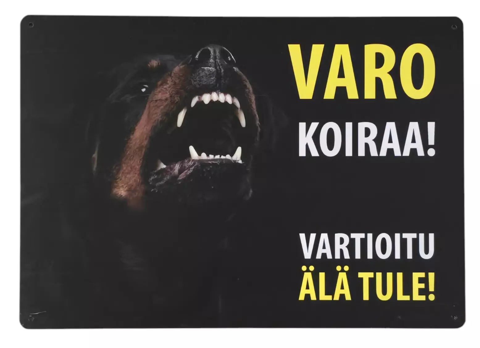 Varoituskyltin nurkissa on kiinnittämistä helpottavat pienet reiät ja sen kulmat ovat pyöristetyt.