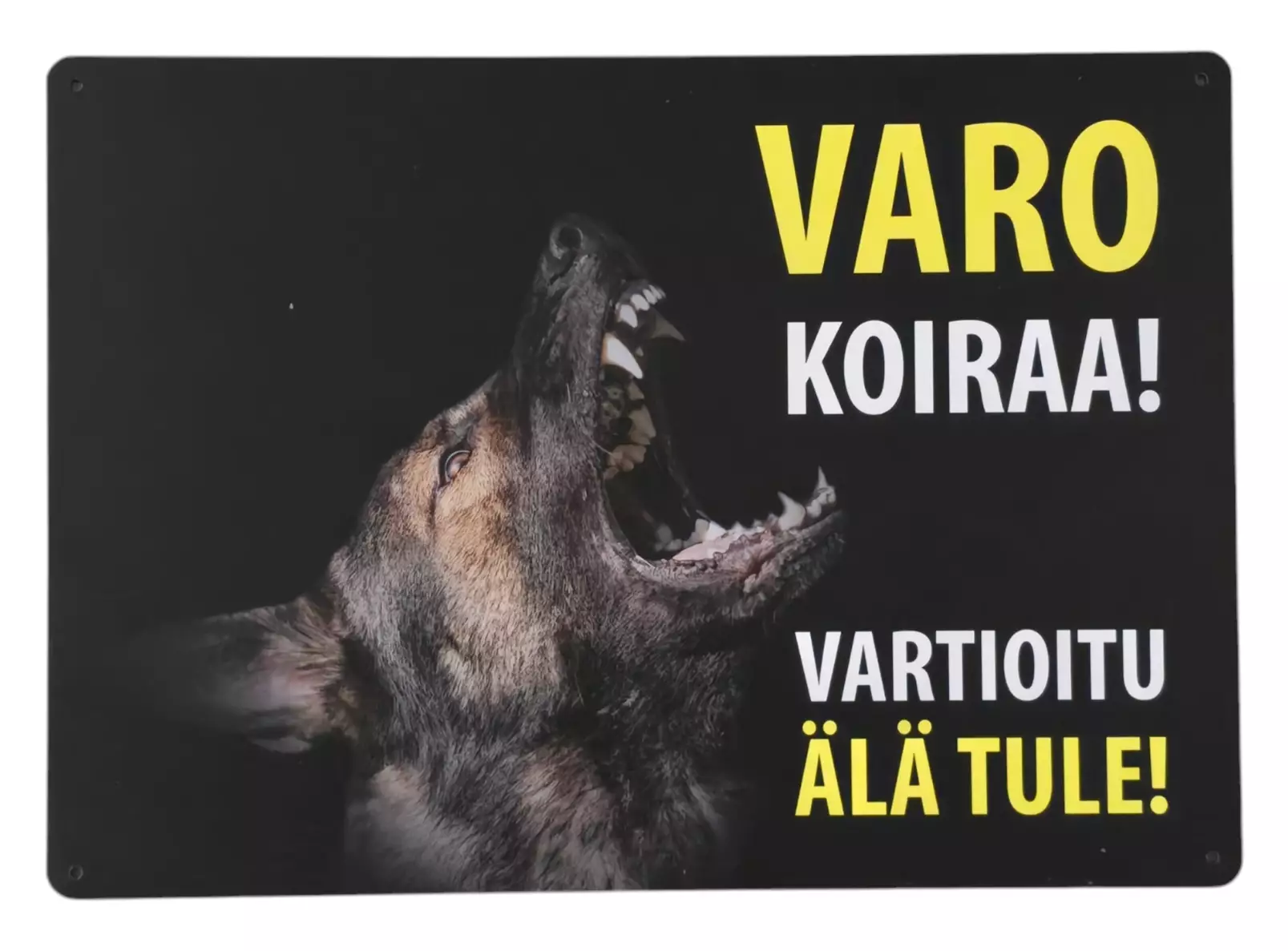 Varoituskyltti Saksanpaimenkoira, musta on säänkestävä, alumiinikomposiitista valmistettu varoituskyltti, jossa on painatettu kuva ja teksti. Ei siis huolta irtoavista tarroista!